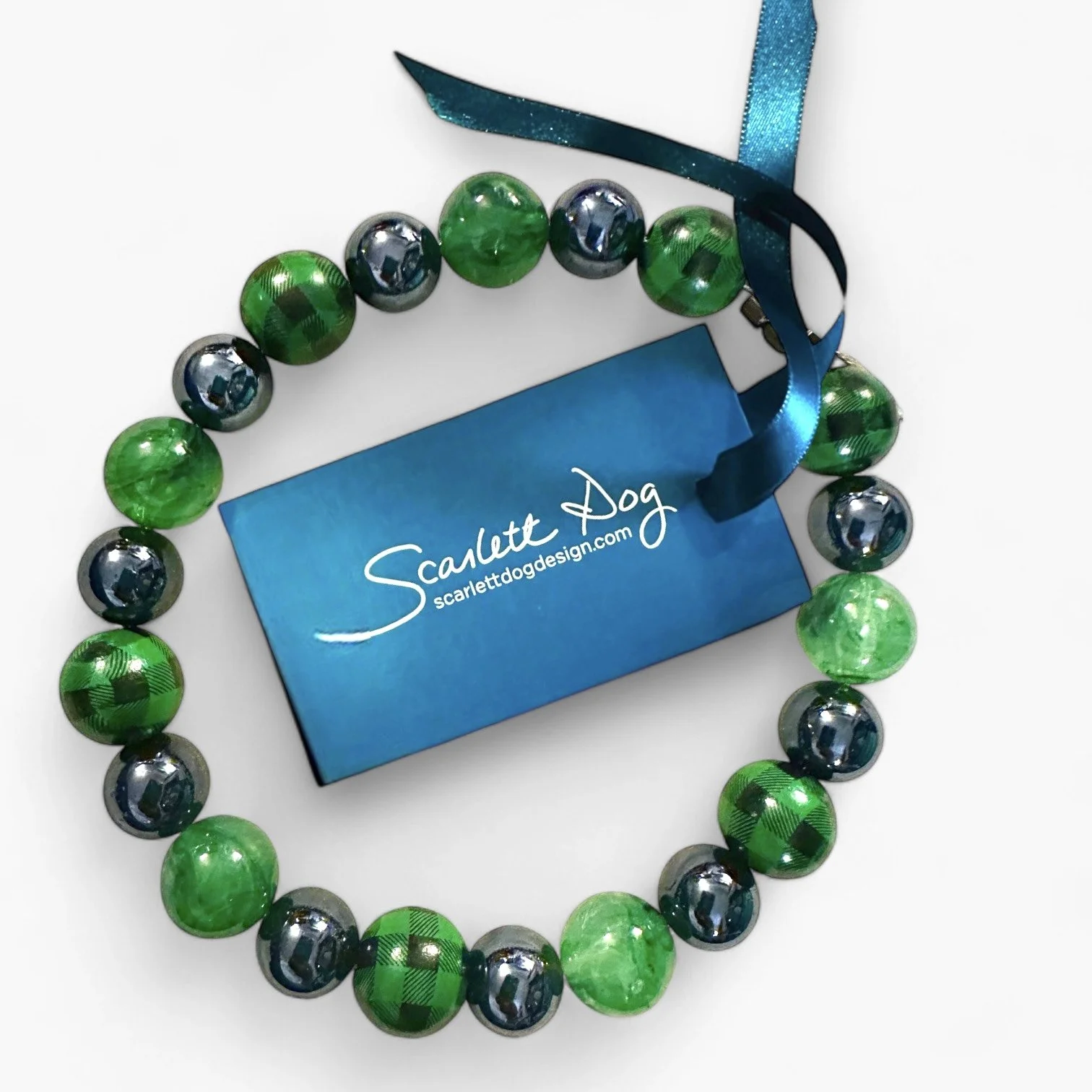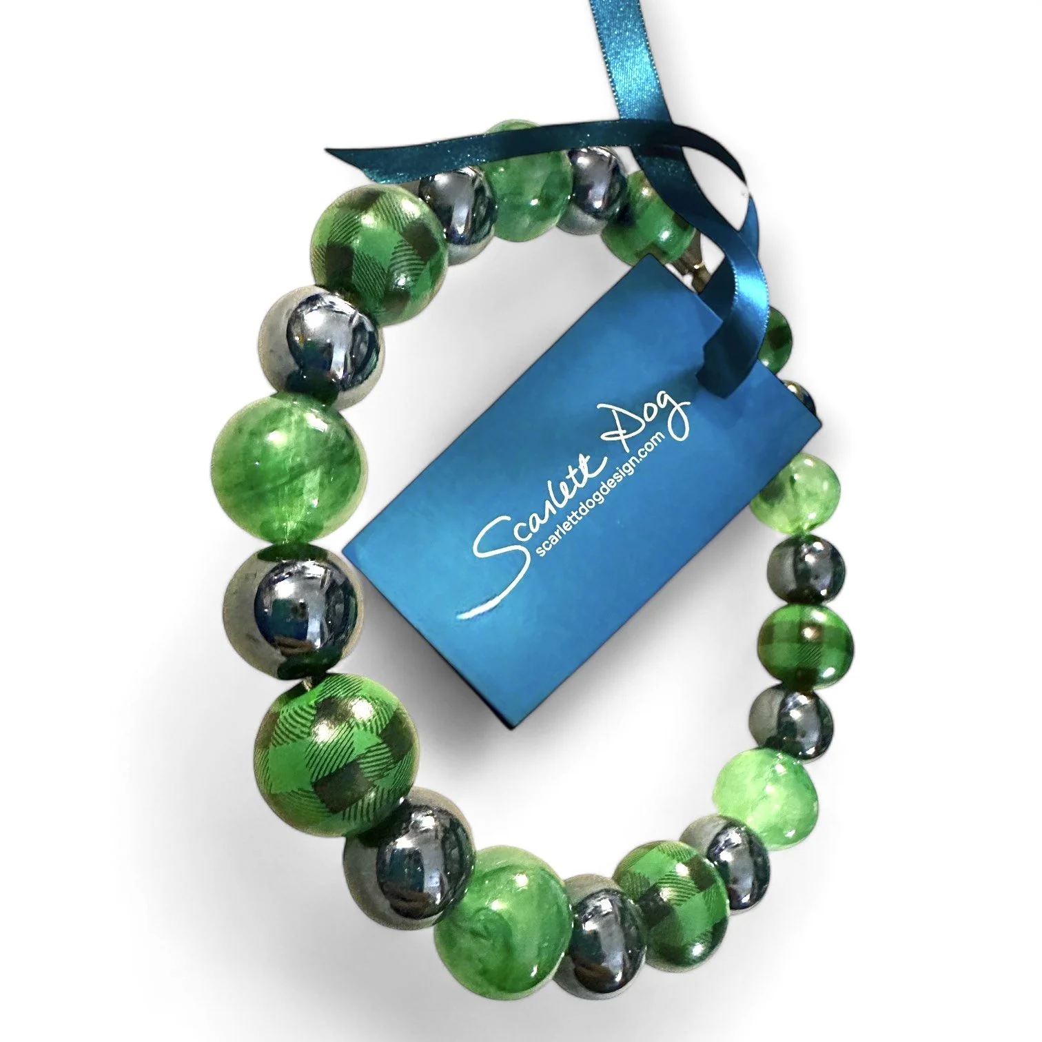 Our Vert Noir Plaid necklace is made with wood beads, hand-painted green and black plaid and interspersed with hematite* and aventurine*. Available sizes start at 7” with your choice of hardware. Vert Noir Plaid also comes in a sparkly version with black and platinum rhinestone beads